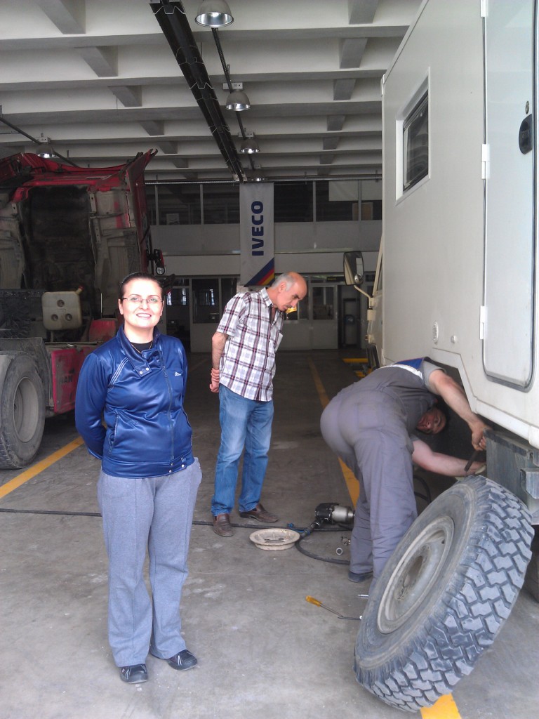 With near silent brakes we continued our tour of garages and stopped in at an Iveco one we had spotted to get some replacements bolts for the ones that had rounded off before. Everyone there was incredibly friendly and very happy to help. It was a family firm, and we were introduced to Eda, one of the girls who worked as an accountant and spoke very good English. Tea was again in our hands before we knew it and the bolts were fitted free of charge, and Ivor was even given a wash before photos were taken from both sides, and we were sent on our way.