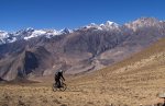 We rode in a group with another couple from Slovenia, who were also on a trek organised by the same Pokhara outfit. We slogged our way up the incline leaving Muktinath in the direction of Larpa that took us over a ridgeline that just pushed the 4000 meter mark, from then on it was almost all downhill. Contouring down the far edge of the ridge we were treated to loose rocks and dusty switchbacks, then the true ‘freeride section’ of the day would begin. Santoram pointed out clumps of vegetation in the distance, or perhaps a pile of rocks, and we would weave our way towards them through the lunar landscape in any route of our choosing. The closest thing to off-piste that we will ever get as mountain bikers.
